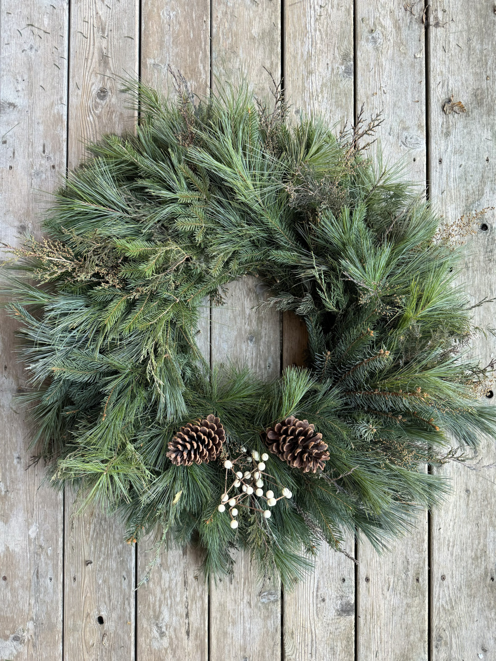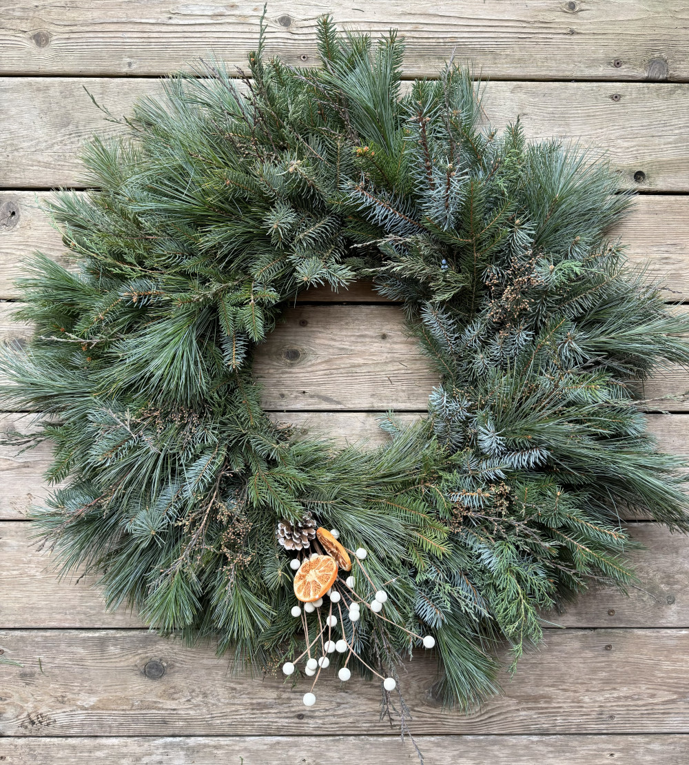Each of our handcrafted wreaths begins with a sturdy 14-inch metal wire base and is layered with fresh, organically grown greenery to create a full, lush final product with a 24-inch diameter. Every wreath is unique, bringing the elegance and beauty of nature into your home sustainably. Perfect for adding a vibrant, eco-friendly touch to any space.
