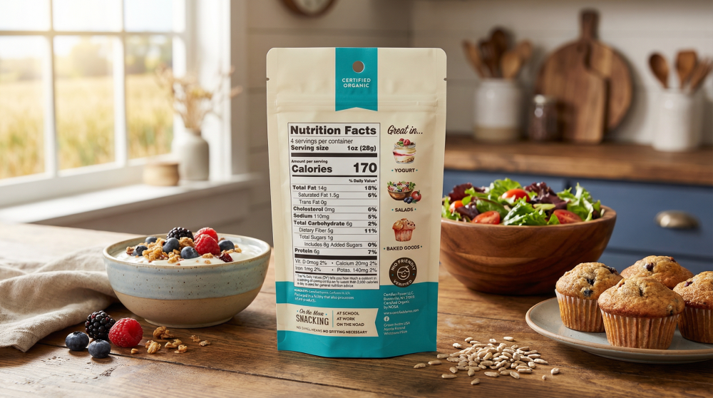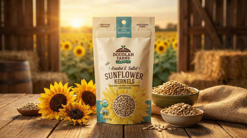 Doudlah Farms' Sunflower Kernels are certified organic, roasted, and salted, offering a satisfying crunch and nutty flavor. These kernels are a good source of fiber, iron, vitamin E, and selenium, ensuring a nutritious snack option. Located in Evansville, WI, Doudlah Farms is led by sixth-generation farmer Mark Doudlah, who transitioned to regenerative organic practices to honor his father's battle with cancer linked to farm chemicals. Every batch is produced without synthetic pesticides or fertilizers, reflecting their commitment to clean, sustainable farming. Enjoy these versatile kernels as a topping for salads or blended into trail mixes for a wholesome snack.
